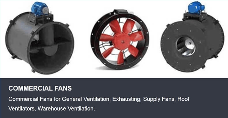 Commercial Fans and Blowers, General Industrial Blower packages, Roof Ventilators, Axial Fans, Inline Fans, Warehouse Ventilation Fans . Smoke Exhaust Blowers, Welding Extraction Blowers, Dust Collection Blowers. Filtered Supply and Exhaust Blowers. Blowers for Lab Exhaust, Make Up Air Blowers, Clean Room Blowers and Commercial Food Exhaust Fans and Blowers.